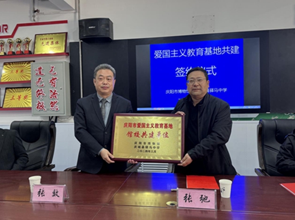 签字仪式上,驿马中学校长张效、庆阳市博物馆副馆长张驰分别就此次活动做了讲话。对“馆校共建”活动的意义和开展学校第二课堂的主要作用进行了阐述,鼓励广大师生走进博物馆,把馆校共建活动有声有色地进行下去。签字仪式结束后,校方为博物馆授牌,博物馆为学校赠送了图书资料。