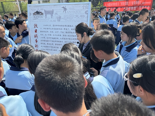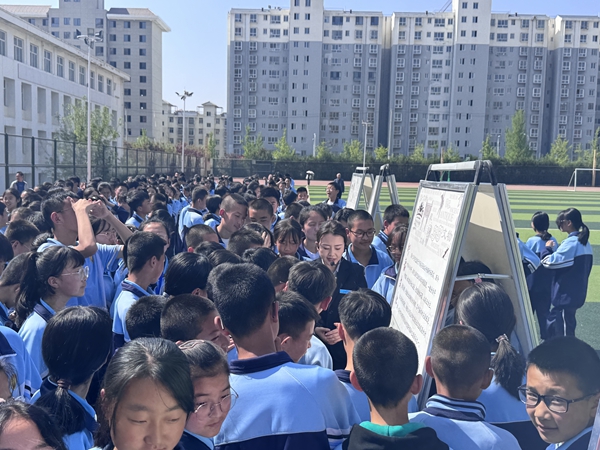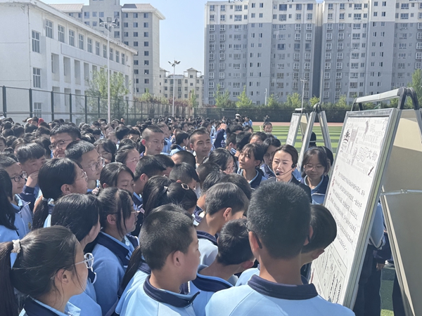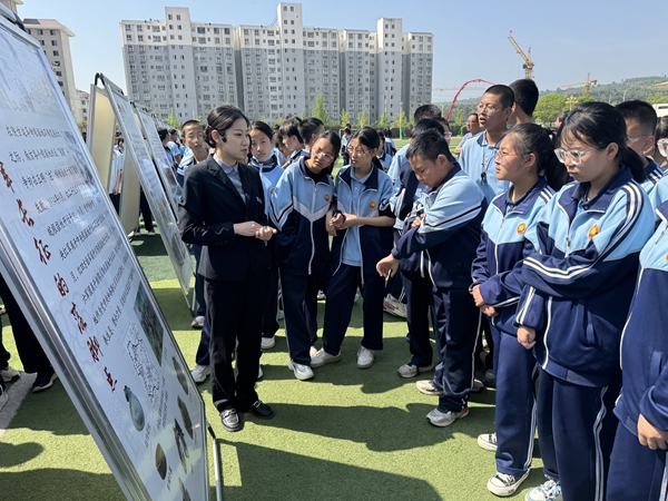 在学校广场上,博物馆的讲解员为宁江初级中学的 1000 余名师生详细解读了 30 块展板的内容。讲解员对庆阳悠久灿烂的历史文化、红色革命历史以及民俗文化进行了全面介绍,让同学们真切地领略到了家乡深厚的人文历史和文化底蕴。