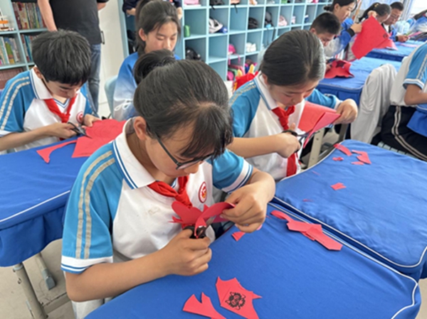 讲解结束后,在老师的指导下,同学们开展了剪纸手工活动。剪刀翻飞,一张张方寸间的红纸,经过精心裁剪,不一会儿就“变身”漂亮的窗花……同学们在一折一剪中,创作出各种千姿百态的作品来,感受“非遗”魅力,同时也把期望、祝福留在剪纸作品上。